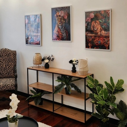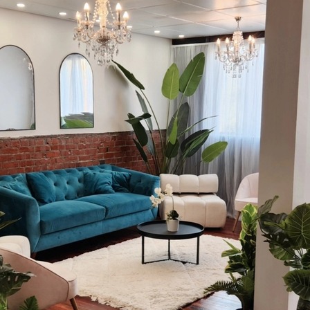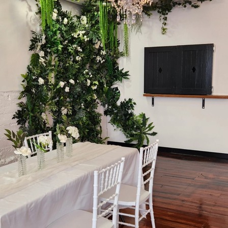 Creeping greenery walls, sparkling chandeliers, tables + chiavari chairs, sound system & mic, topped off with a gorgeous loft-style lounge space.